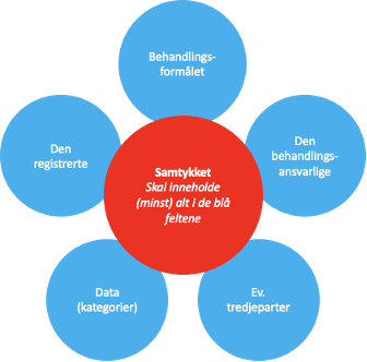 Et samtykke må anses på som en kontrakt og den kontrakten har et spesifikt innhold. Kontrakten styrer hvem du kan dele data med og hvem man ikke kan dele data med. Et samtykke (kontrakten) har minimum disse bestanddelene: